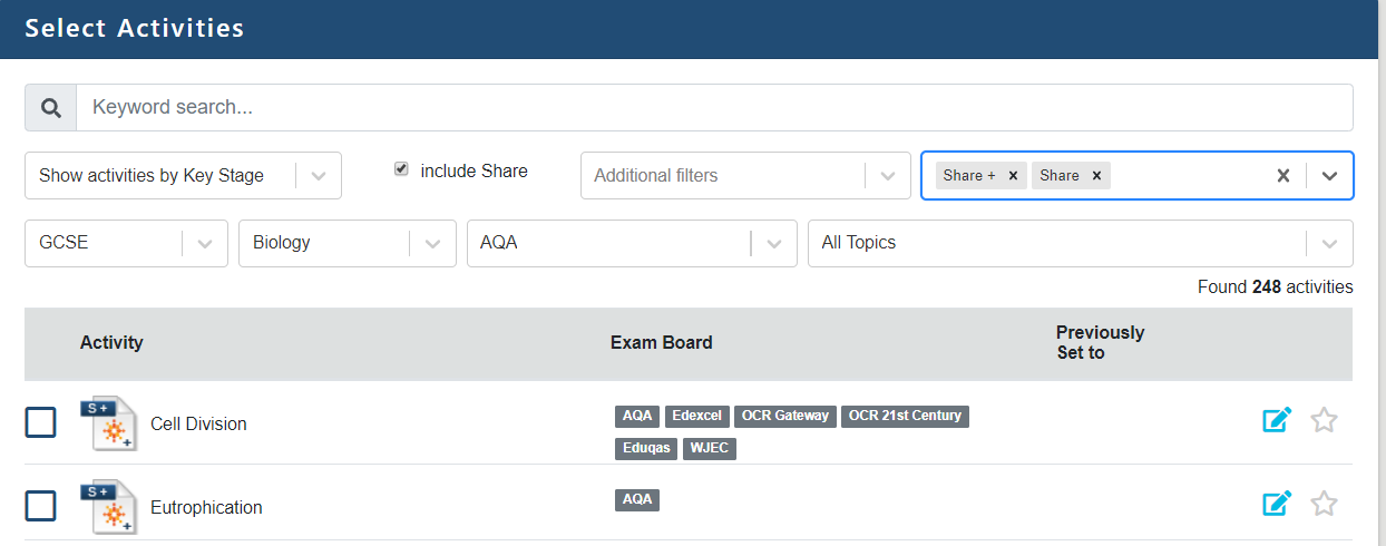 Share and Share+ activities can be located using the filters on the "Set Tasks" Tab, in the "Select Activities" section.